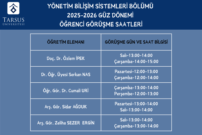 Görüşme saatleri içerisinde öğretim elemanlarımızla akademik, idari ve diğer konularda bireysel görüşmeler yapabilirsiniz. Tüm öğrencilerimizin bu saatlere riayet etmesi önemle rica olunur.